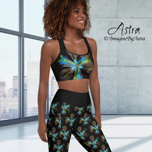 Tropical Iris High Waisted Yoga Set with Pockets - Black