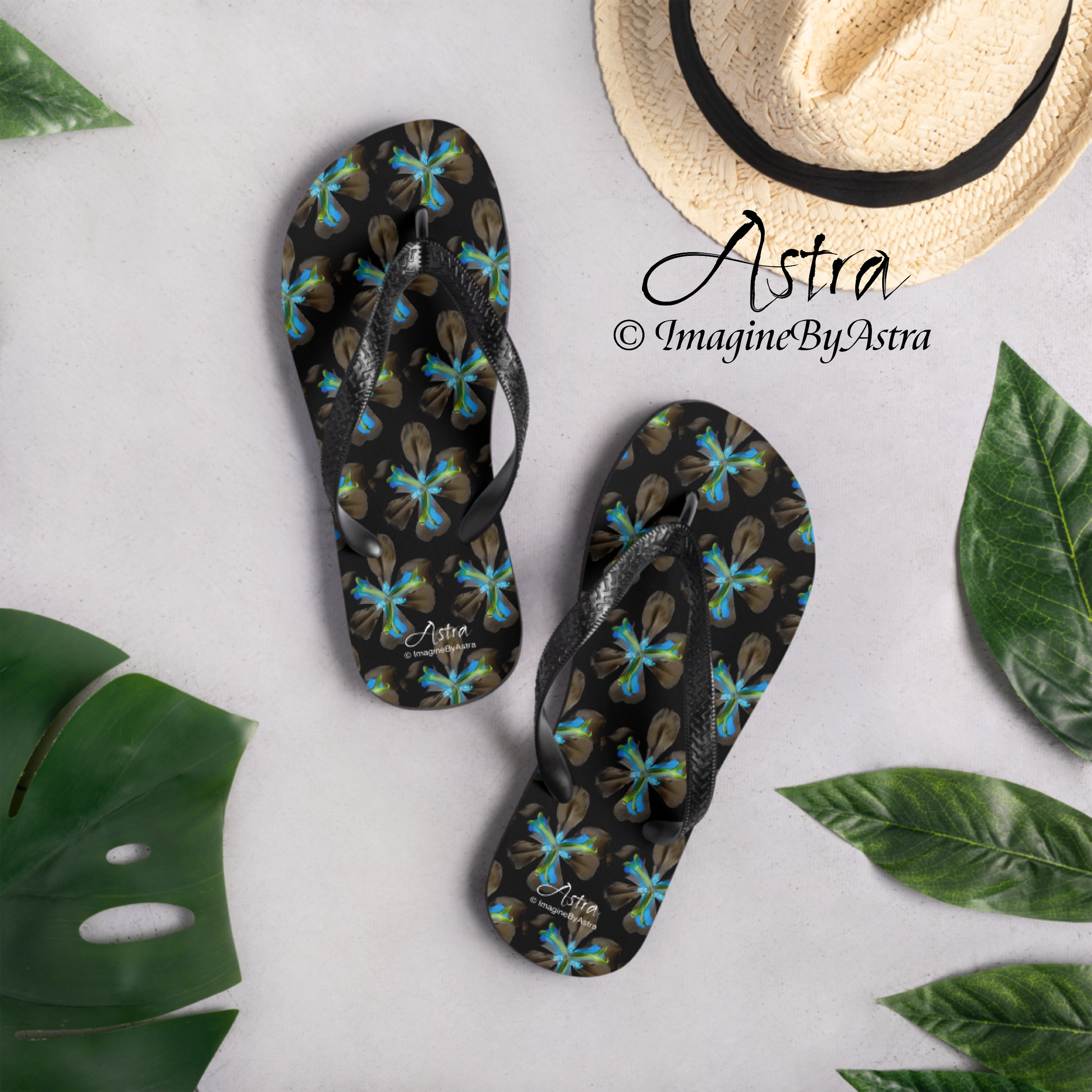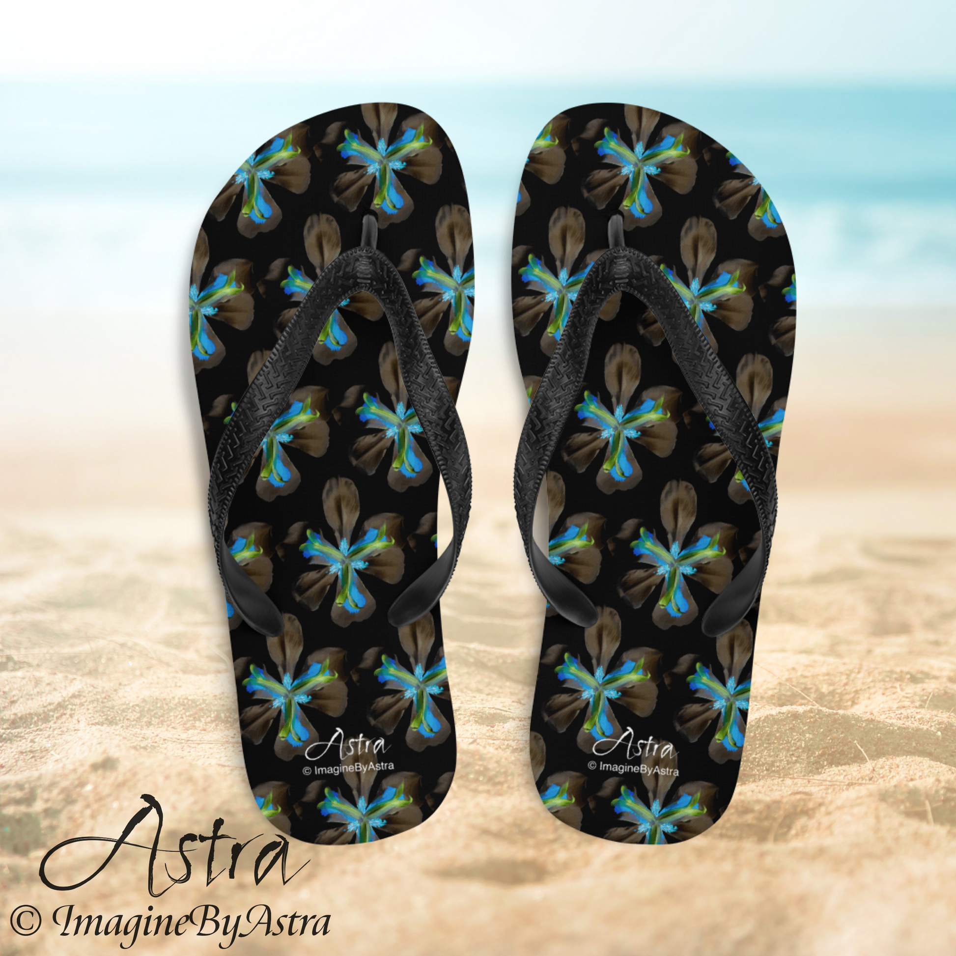 Step into style with these exotic tropical flower flip flop sandals with a fabric top sole and soft and supportive foam rubber tread. Comfy around town and easy to pack for the beach, yoga or vacation.