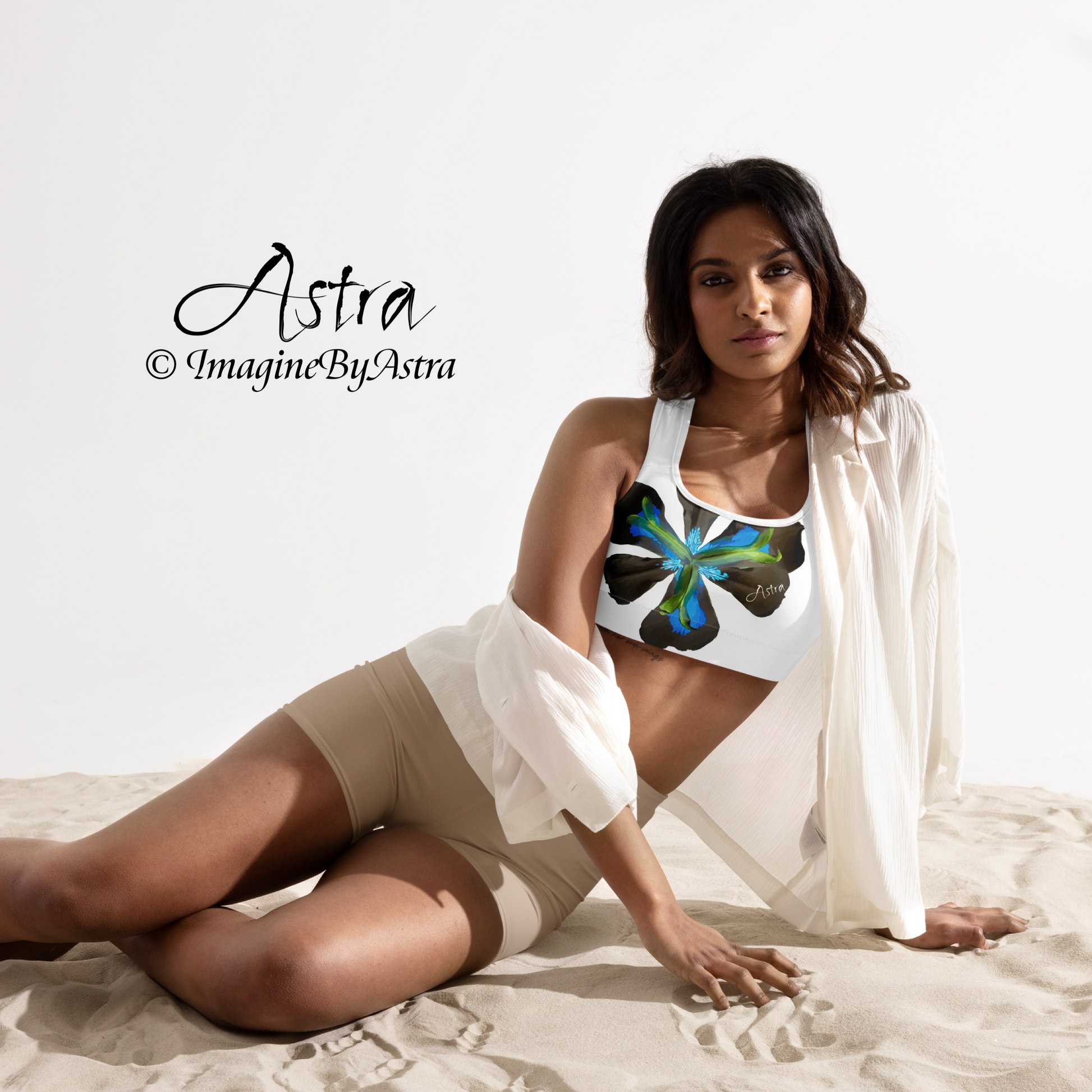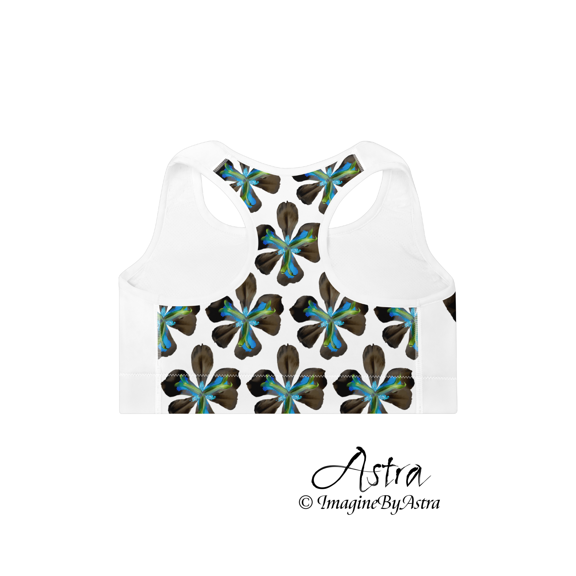 Show off this exotic tropical flower sports bra at the gym or around town and consider pairing with the matching yoga leggings from the Tropical Iris Resort Collection from ImagineByAstra.