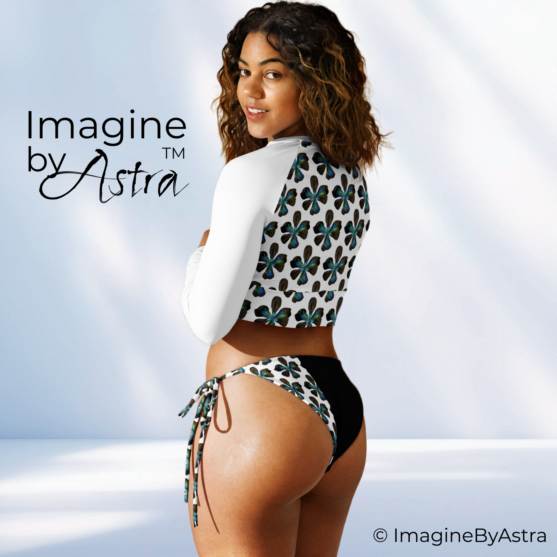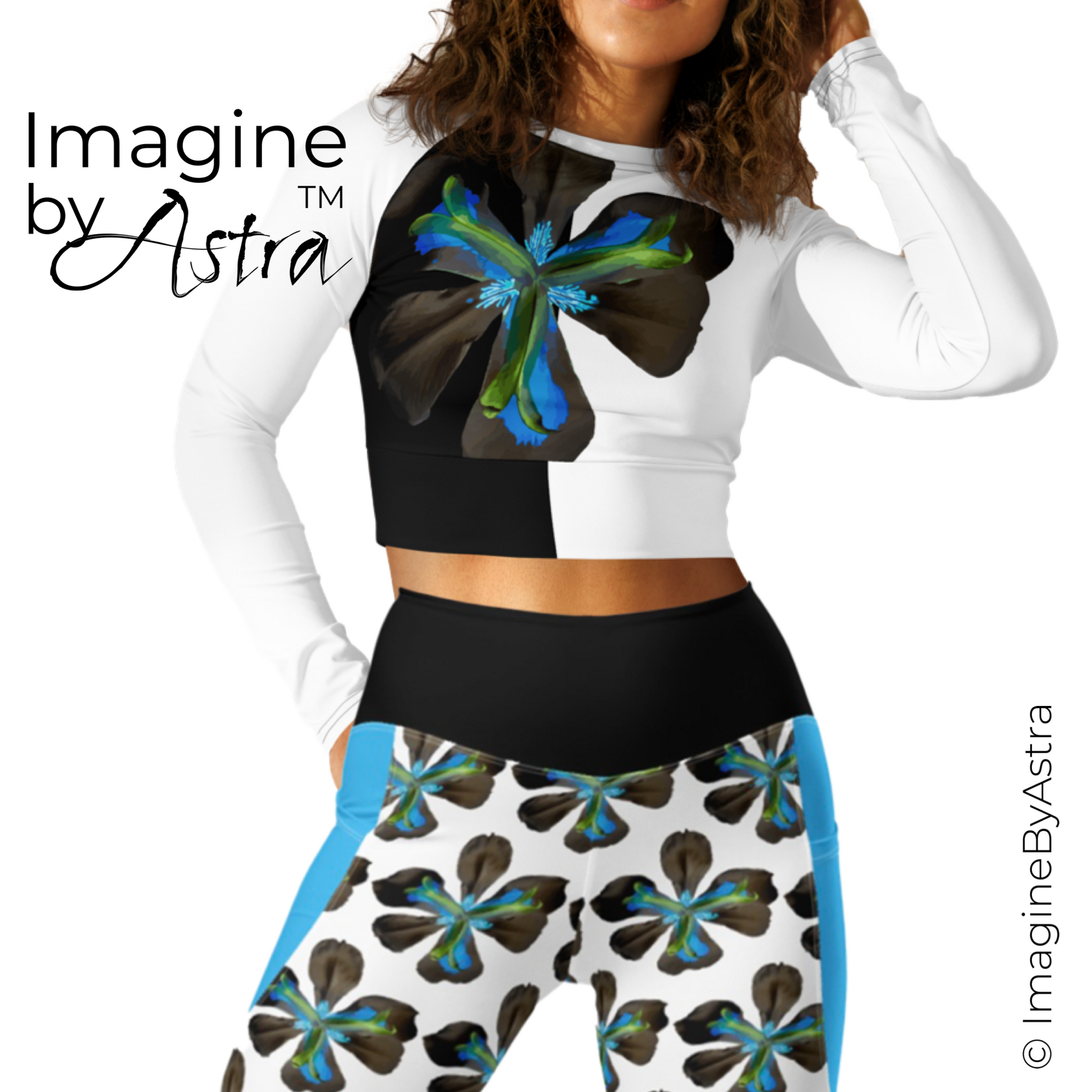 Stunning long-sleeved crop top with a tight hugging fit for workouts, water sports or simply looking fabulous. Matches with any leggings or bikini bottom from the Tropical Iris Collection.